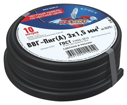 Rexant Кабель силовой медный ВВГ-Пнг(А) 3x1,5 мм², длина 10 метров, ГОСТ 31996-2012, ТУ 16-705.499-2010 REXANT