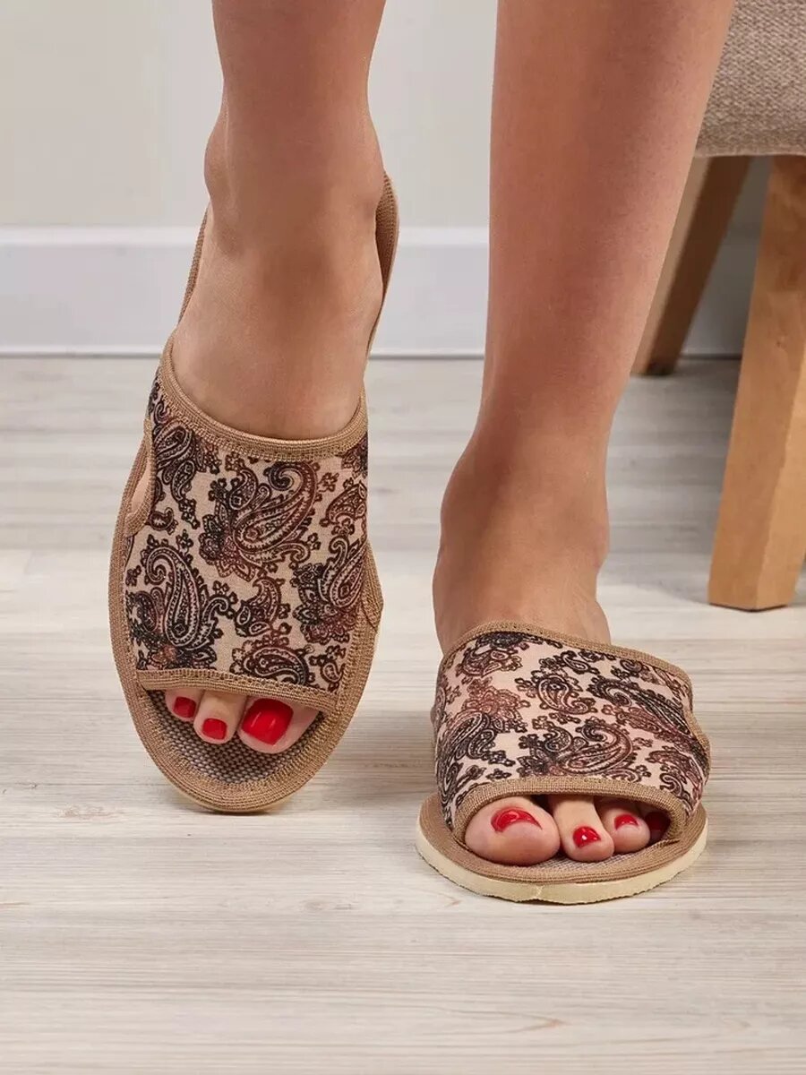 Купить Женские домашние тапочки "LepiloV", открытые, на текстильной стельке. Размер 40. Бежевые огурцы.