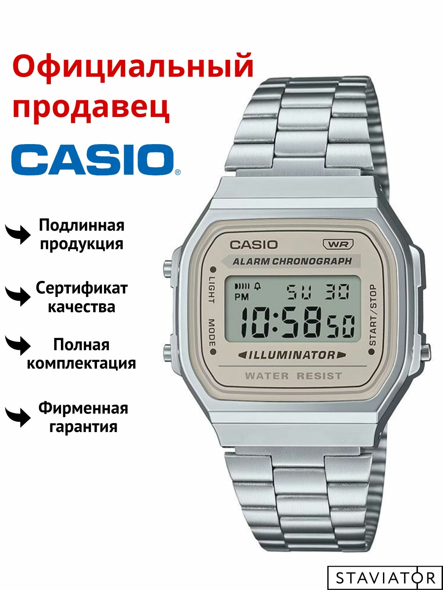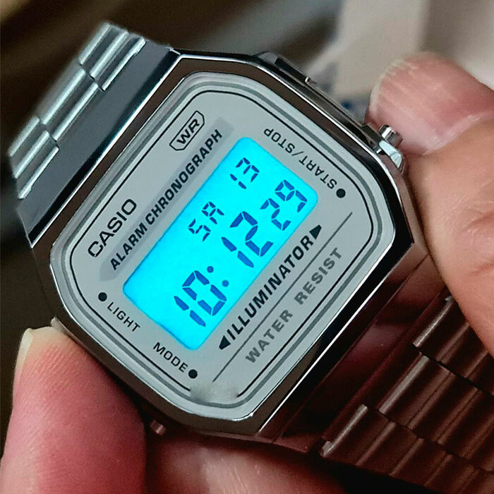 Легкие, удобные на руке. "Модные", в хорошем смысле. Информативные (с моим зрением это важно). Отбивают часы -- удобно. Будильник, конечно, никого разбудить не может)), ставлю его на время, когда уже точно-точно надо выходить на работу. Равномерная красивая подсветка. В "Электронике", да и в старых Casio, была лампочка слева, насколько я помню. Периодически задеваю ими о дверные косяки, но повреждения (они на гранях корпуса, а не на стекле) в глаза не бросаются. Проходят тест Casio на подлинность -- долгое нажатие правой кнопки. |