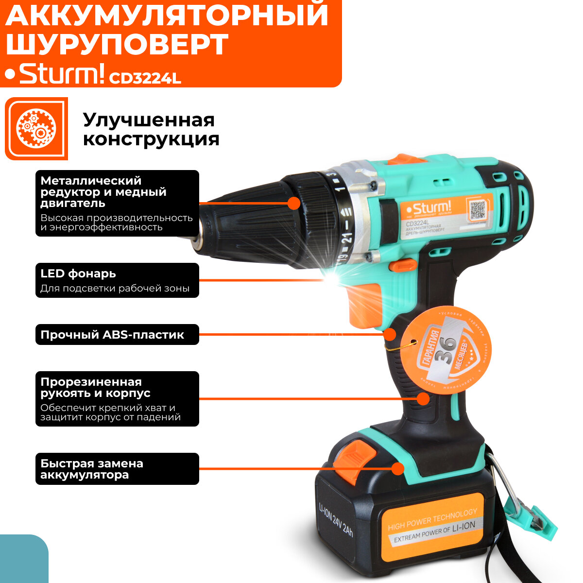 Аккумуляторный шуруповерт Sturm "CD3224L"