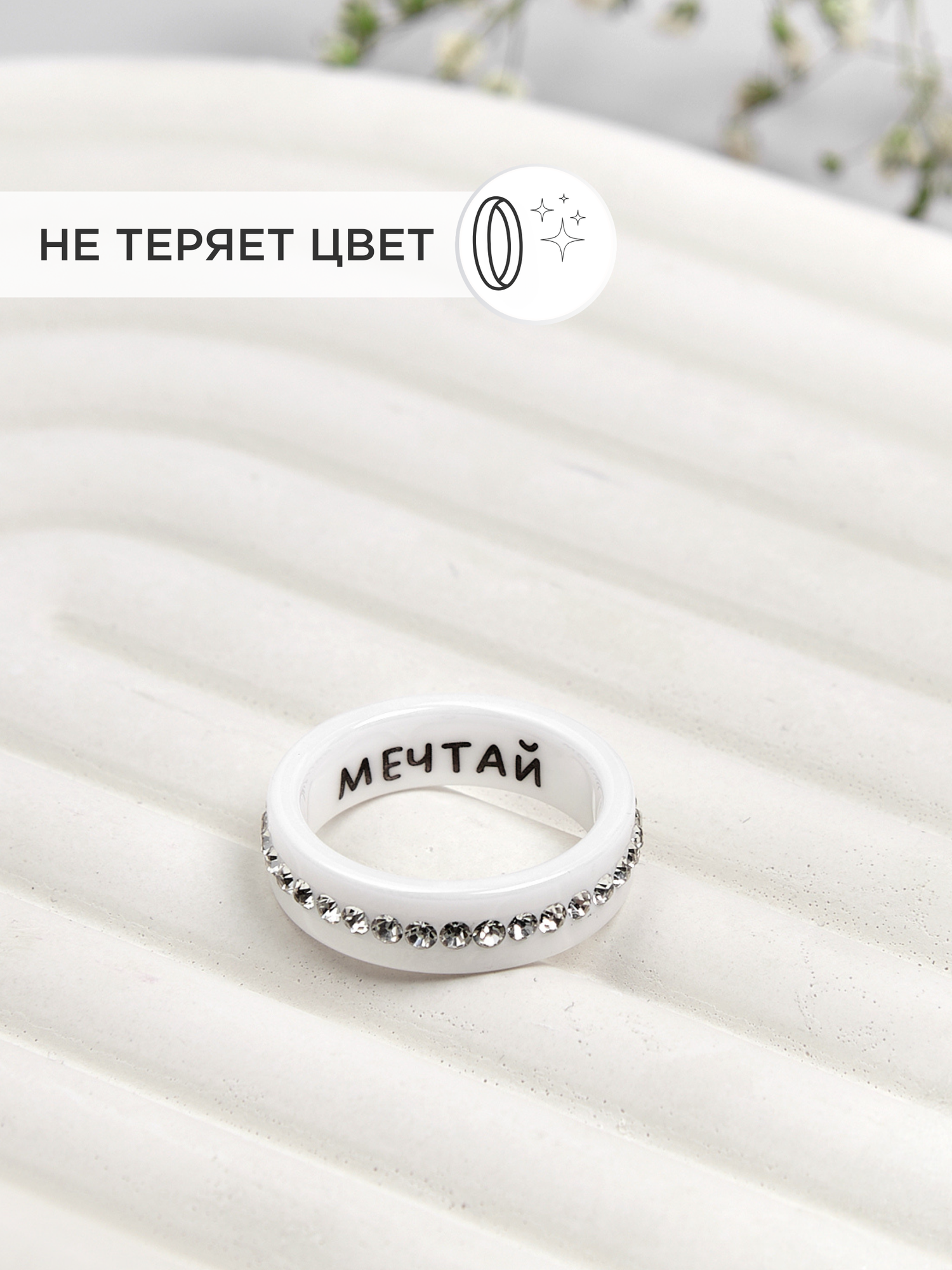 Кольцо бижутерия женское из белой керамики с гравировкой 19 размер