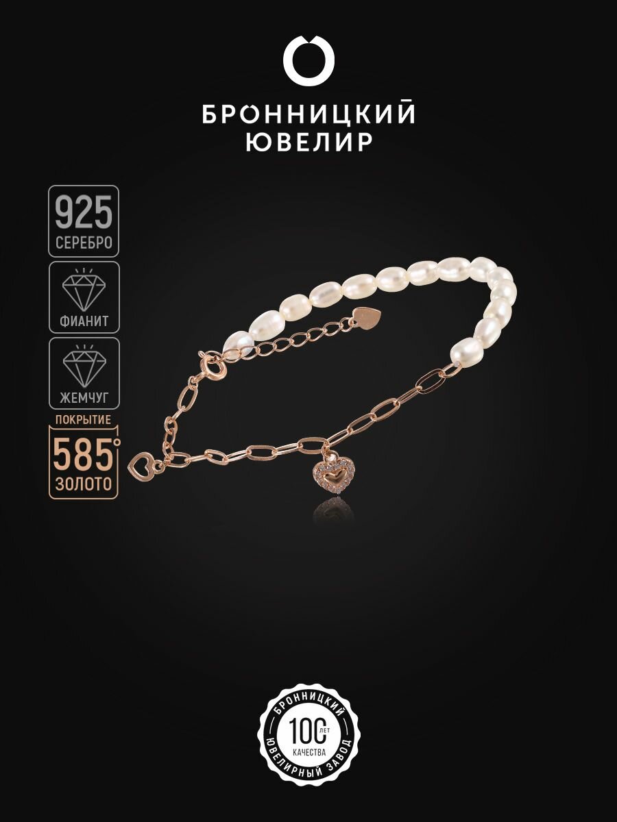 Браслет-цепочка Бронницкий Ювелир, серебро, 925 проба, золочение, жемчуг, фианит, длина 19 см., золотистый