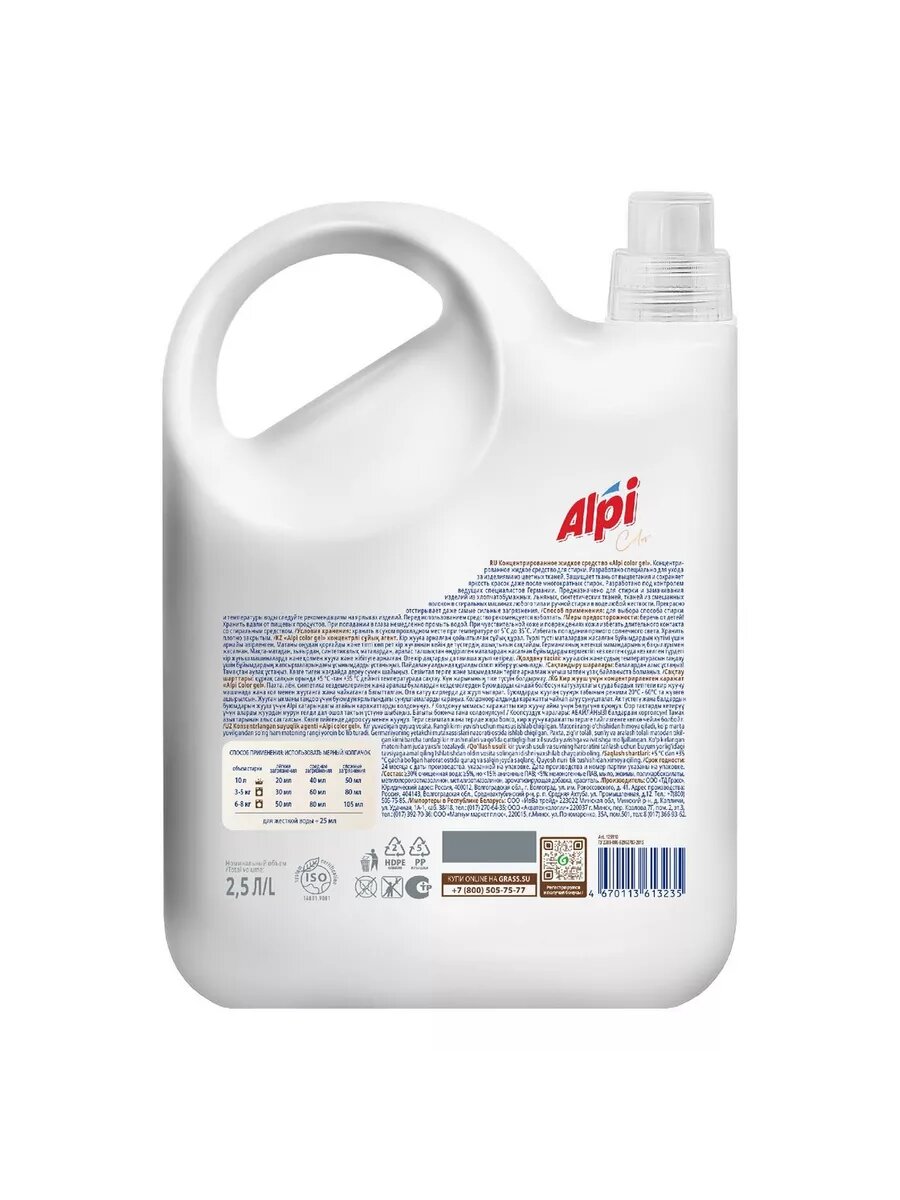 Гель для стирки цветных тканей Grass / Грасс Alpi жидкий концентрат гипоаллергенный без фосфатов в бутылке с флаконом 2.5л / средство для белья