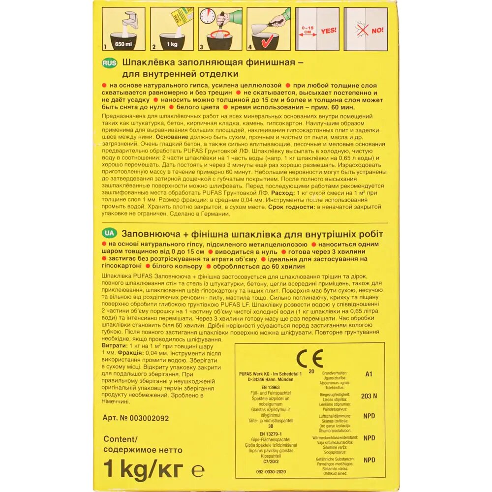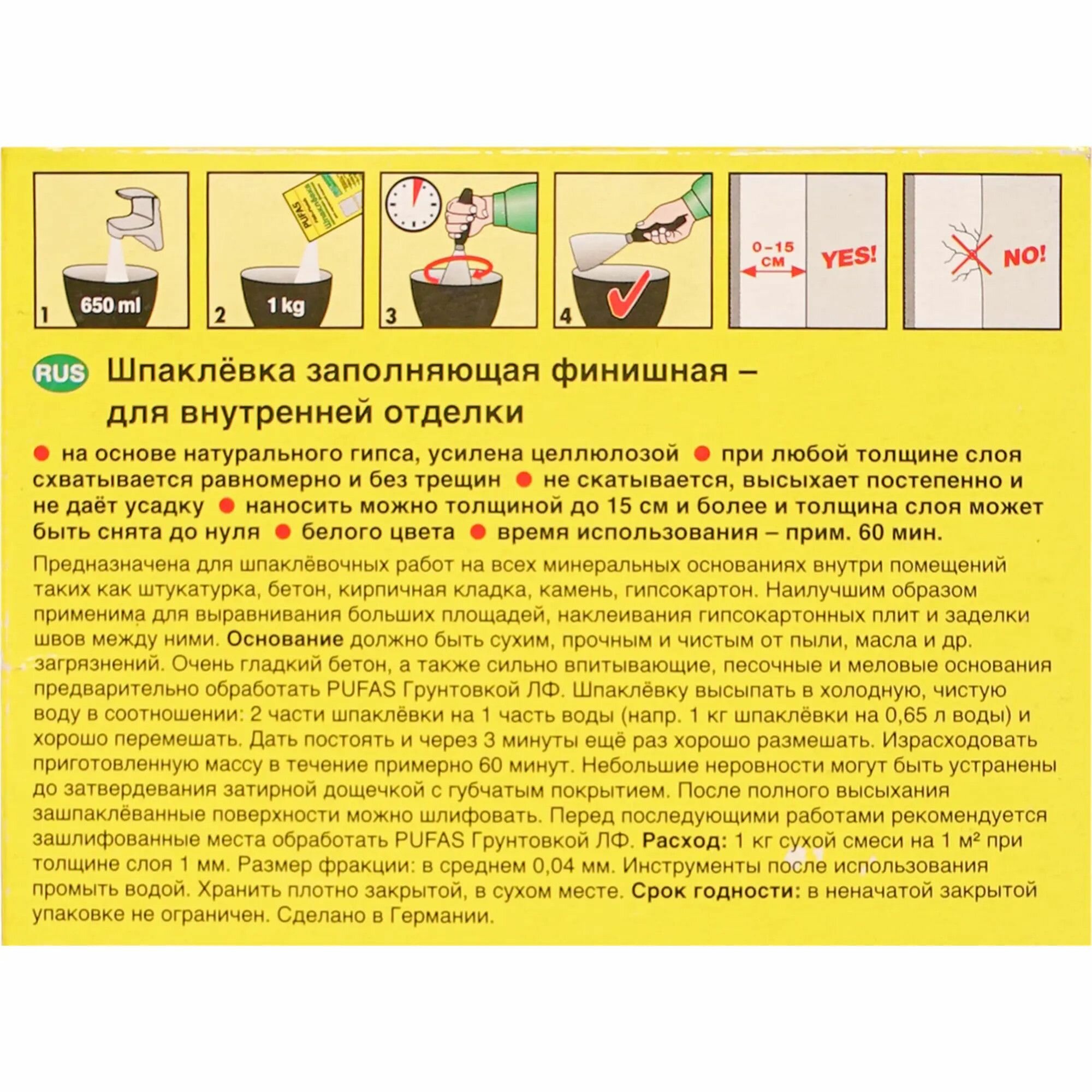 Пуфас Фулл-Финиш шпатлевка гипсовая (1кг) / PUFAS Full+Finish Spachtel шпаклевка гипсовая заполняющая фининшая (1кг)