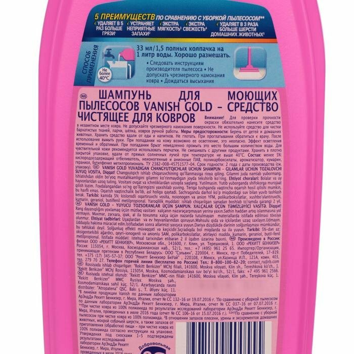 Шампунь для ковров Vanish Gold, для моющих пылесосов, 450 мл (комплект из 3 шт) интересное: