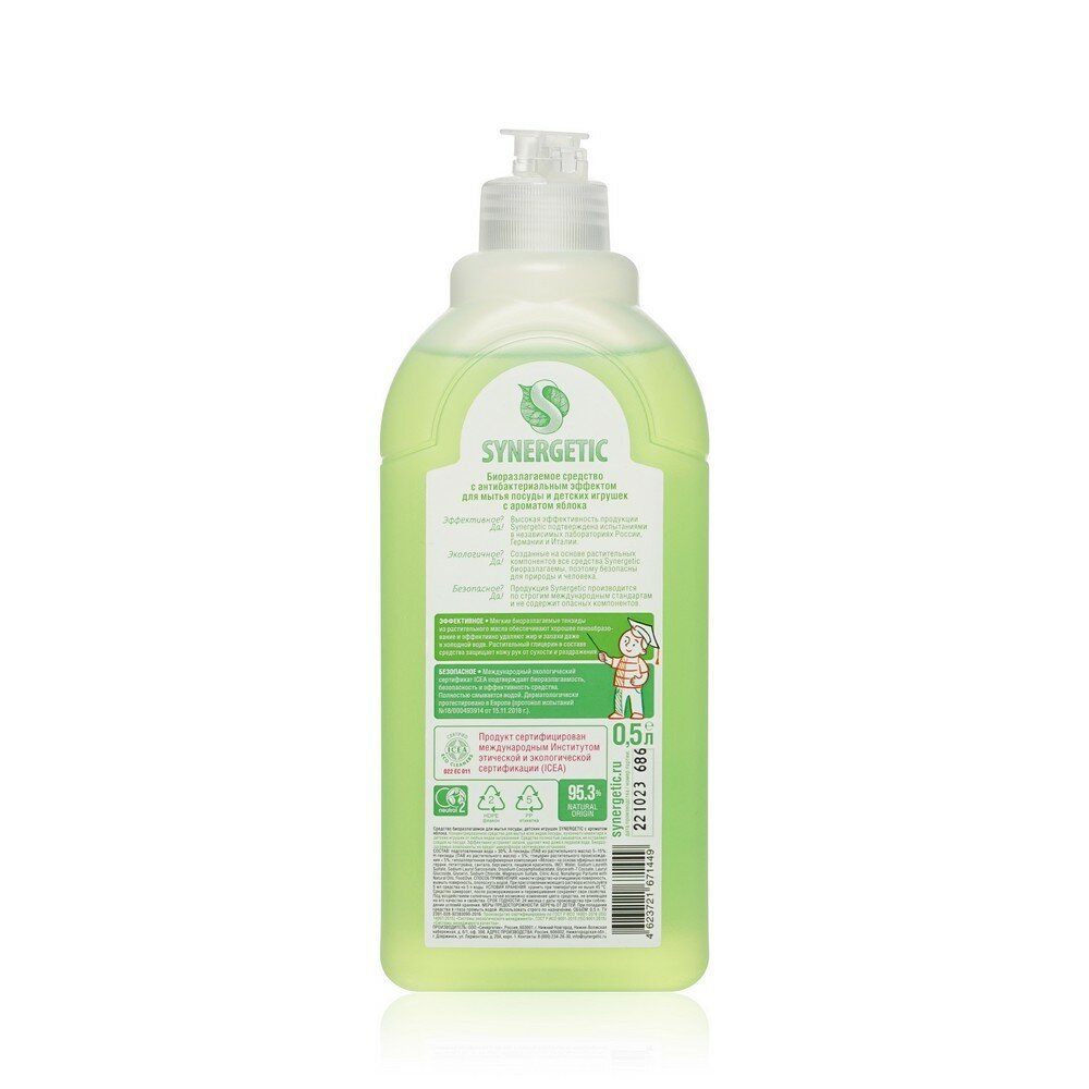 Средство для мытья посуды, фруктов, игрушек Synergetic "Яблоко", антибакт, концентр, с дозат., 500мл