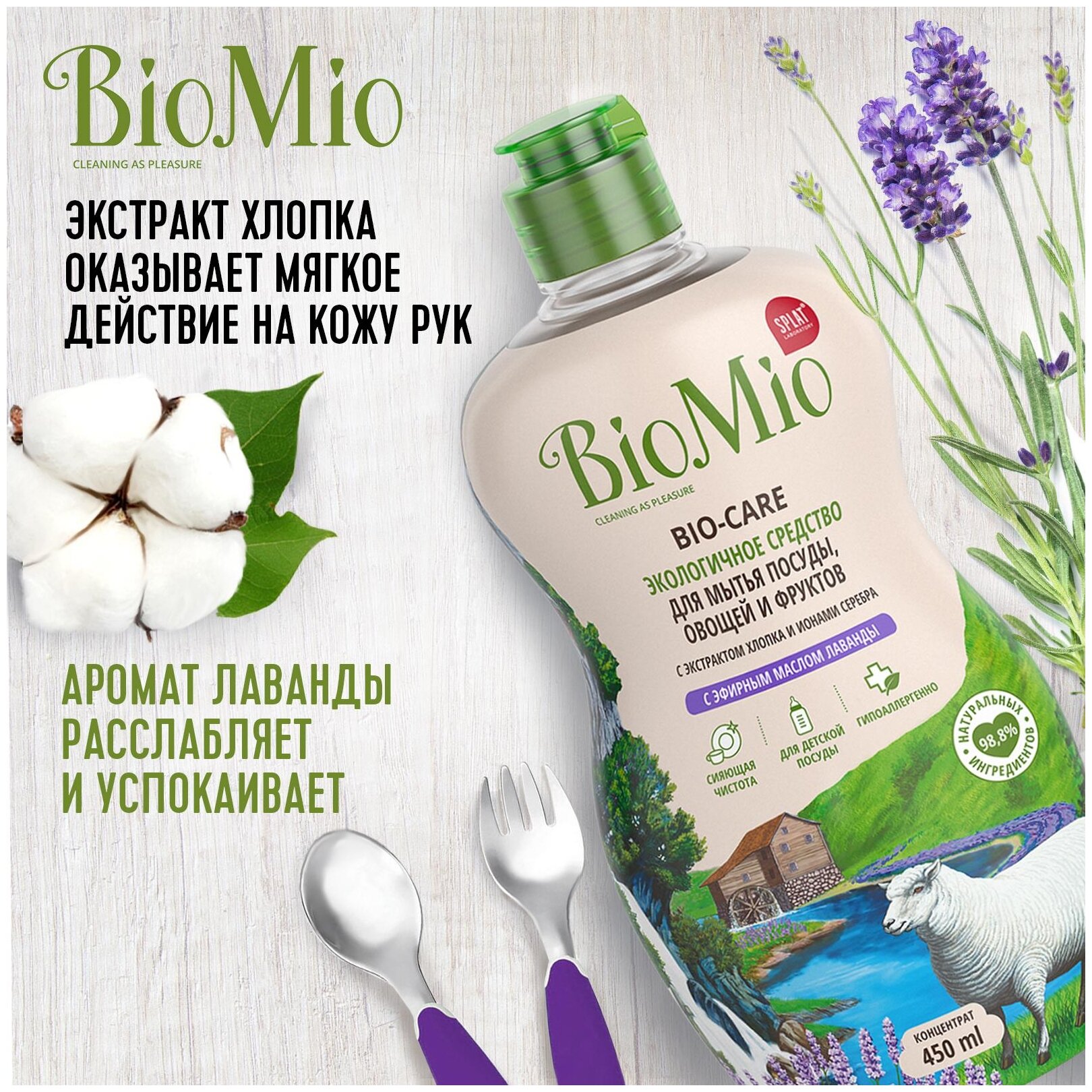 BioMio. BIO-CARE Экологичное средство для мытья посуды (в том числе детской), овощей и фруктов БиоМио. С эфирным маслом лаванды, экстрактом хлопка и ионами серебра. Концентрат. 450 мл