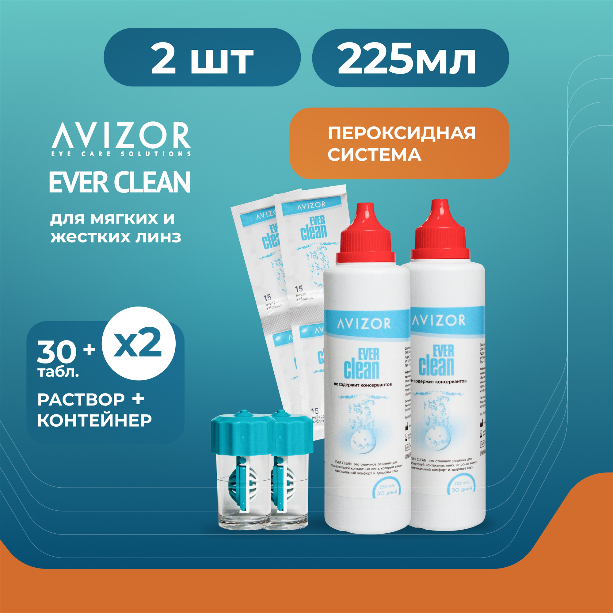 Купить Avizor Ever Clean, 225 мл + 30 таблеток - 2 шт. Пероксидный раствор для контактных линз