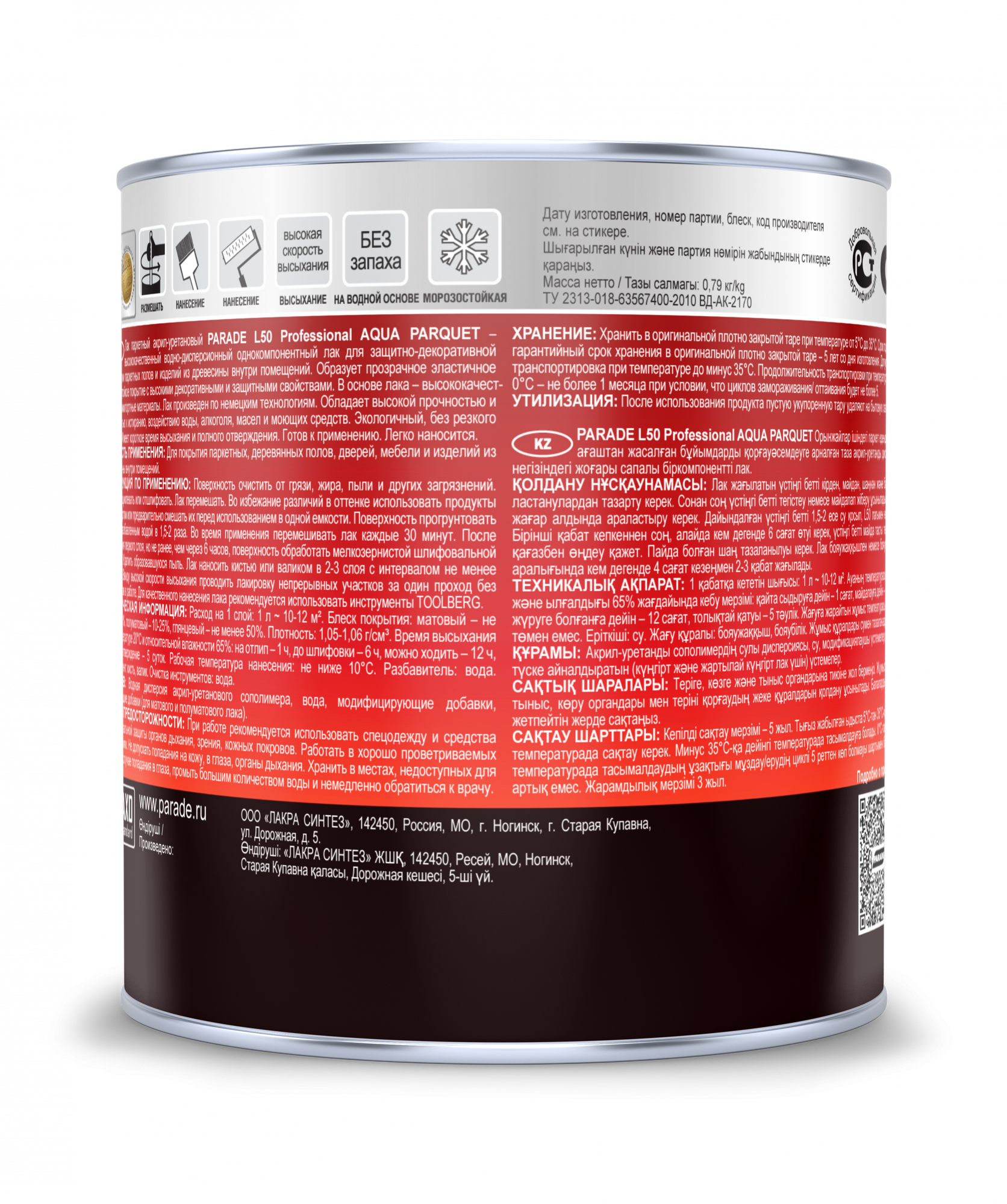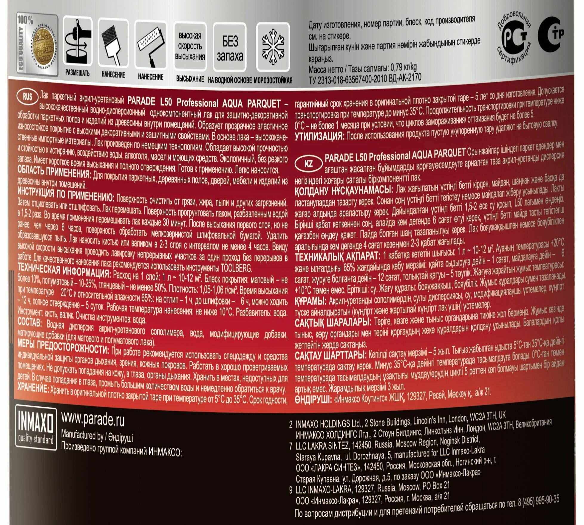 Лак Паркетный Parade Professional L50 Aqua Parquet 0.75л Полуматовый, Акрил-Уретановый, Бесцветный для Внутренних Работ / Парад L50