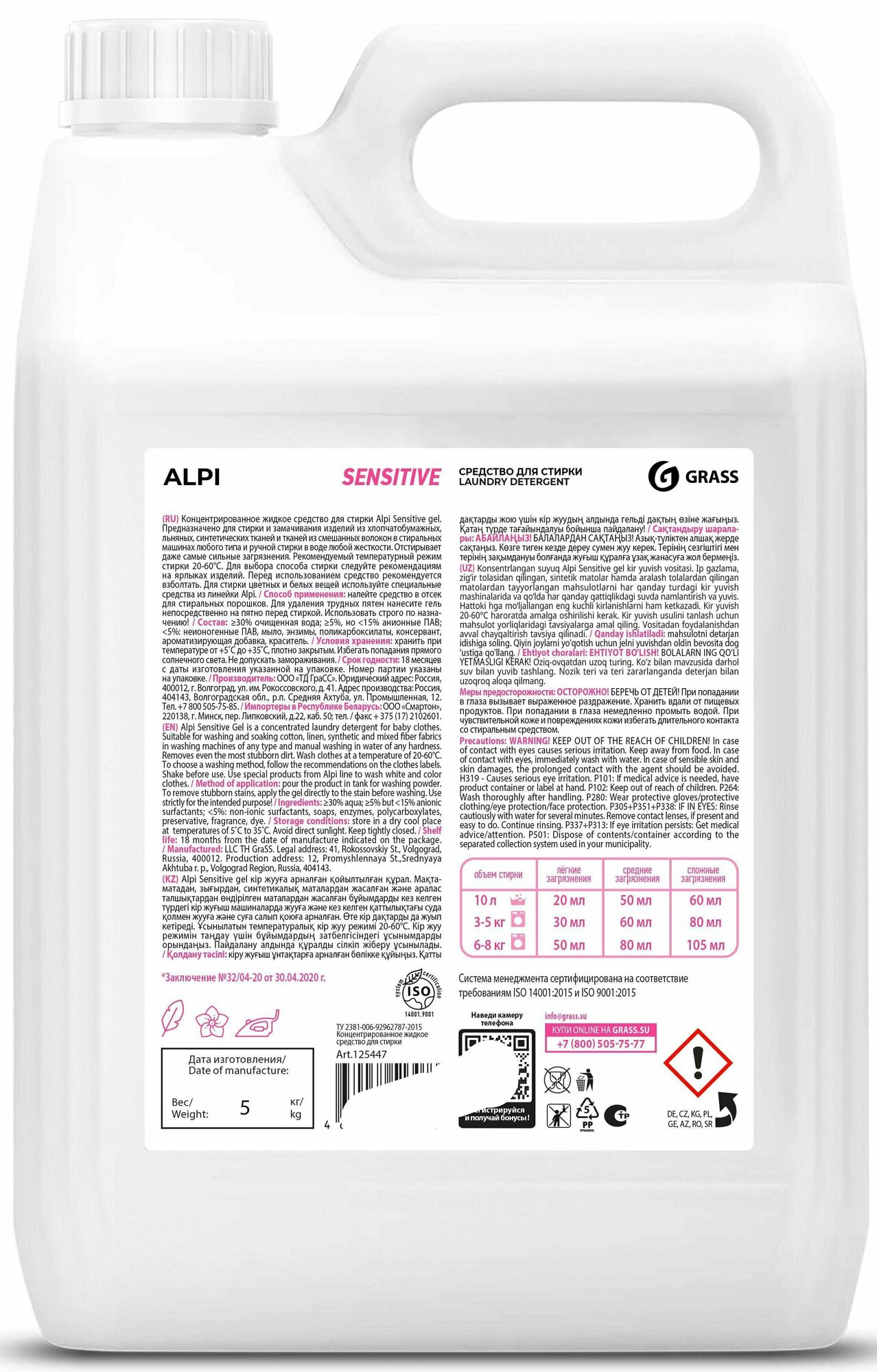 125447 GRASS 125447_гель-концентрат для детских вещей! ''Alpi sensetive gel'' (канистра 5кг)\