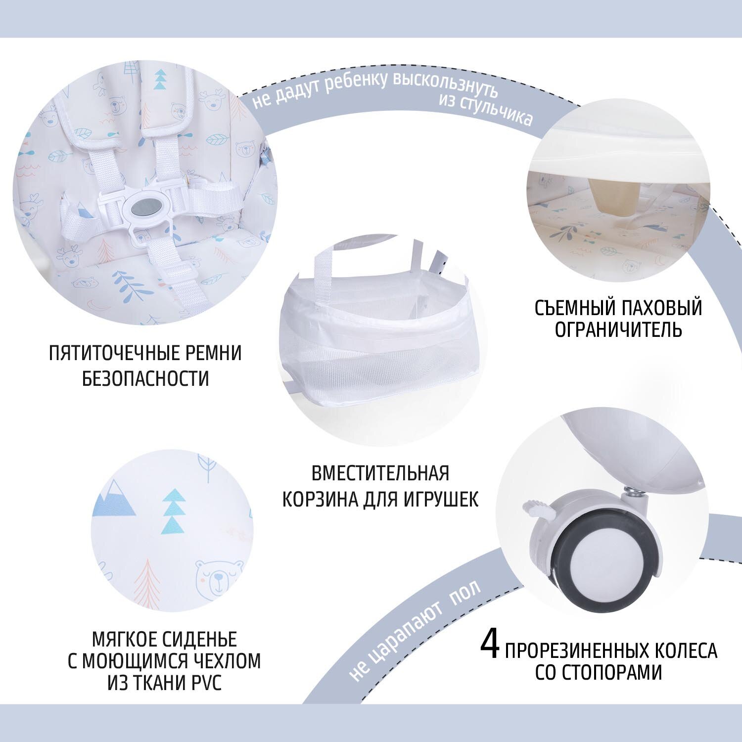 Регулируемые спинка, подножка и столик. Также столик снимается, он двойной, все это позволяет его легко мыть отдельно самого стульчика. Компактно складывает, на колесиках, значит можно легко перемещать по квартире и не только. Большая и каркасная корзина для игрушек. Ткань легко моется тряпкой. Пятиточечные ремни безопасности с накладками для комфорта и безопасности малышей. Можно использовать с 6 месяцев. Может выдержать до 15 килограмм. Перекладины между ножками на расстоянии от пола позволяют легко подмести или помыть пол под стульчиком. Красивые неброские изображения животных на ткани. Качественные крепления, ровные швы, прочный материал.