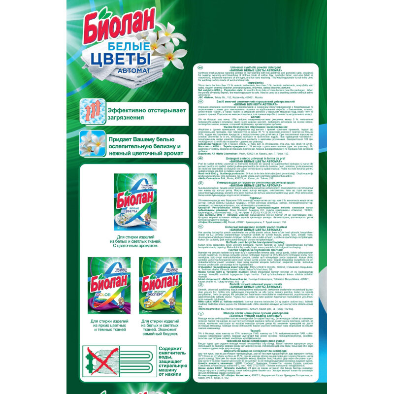 Стиральный порошок автомат 6 кг, БИОЛАН "Белые цветы" Комплект - 1 шт .