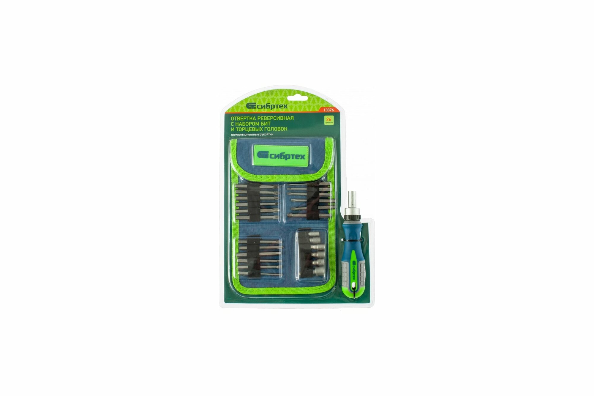 Отвертка реверсивная СИБРТЕХ 13376 с набором бит и торцевых головок, 26 шт., CrV, чехол