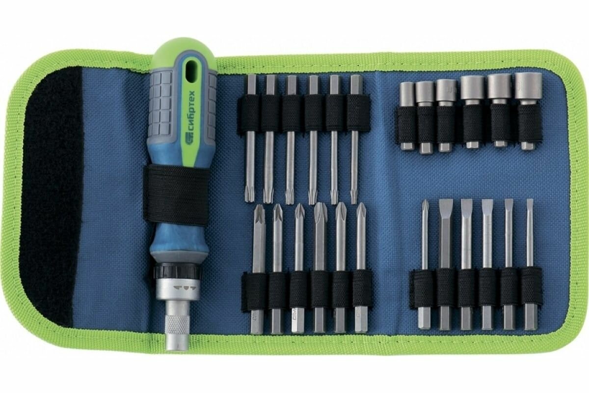Отвертка реверсивная с набором бит и торцевых головок Сибртех 13376, CrV, чехол, 26 предметов 9404 .