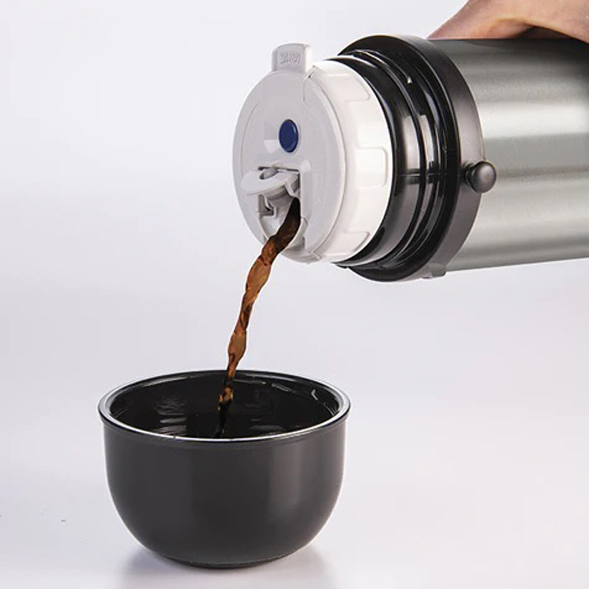Заказывал в Японии. Пользуюсь уже 8 лет. Отлично спасает в поездках. Брал в горы, несколько раз падал на камни( жив,здоров) пластик крепкий. Долго держит тепло. Удобный дозатор налива. |