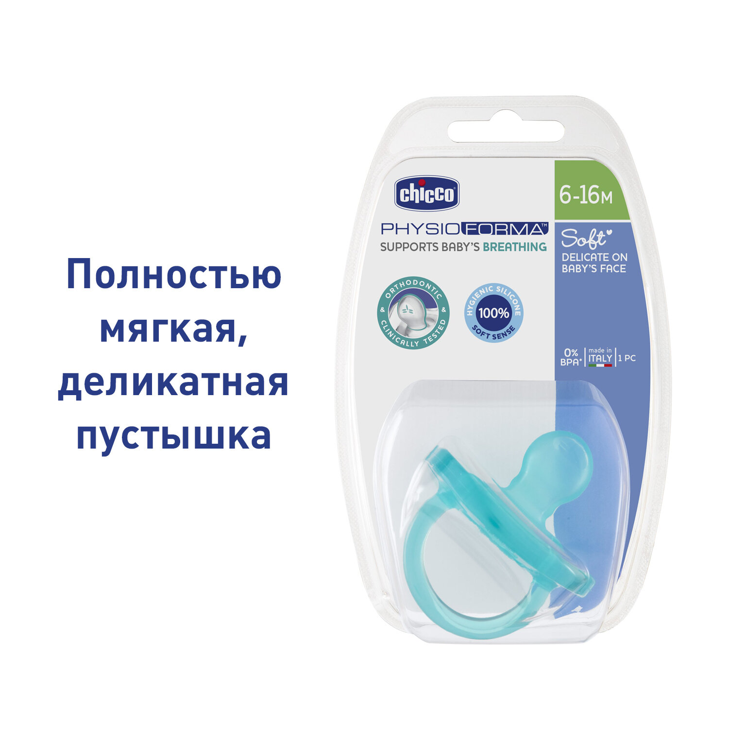 Пустышка CHICCO Physio Soft,1шт.,6-16 мес.,силикон,голубая