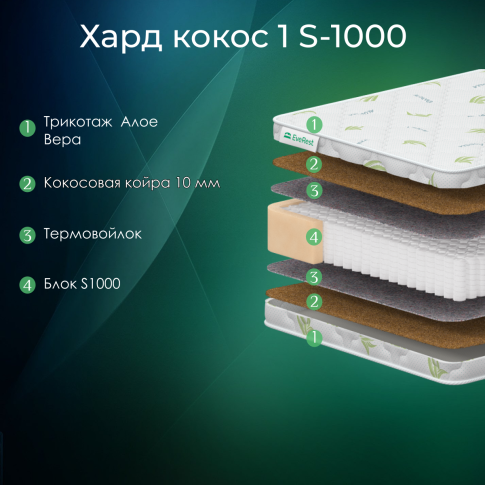 Матрас Everest Хард Кокос 1 S1000 - пружины, независимый блок s1000, 1000 пружин, жесткий для позвоночника, с кокосом, чехол трикотажный 155х200