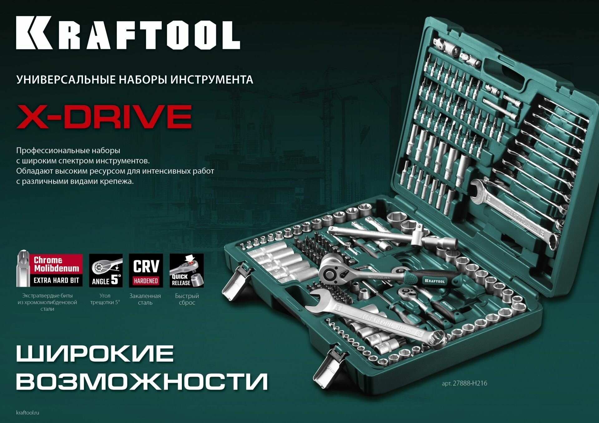 KRAFTOOL X Drive, 216 предм., (1/2"+3/8"+1/4"), Универсальный набор инструмента (27888-H216)