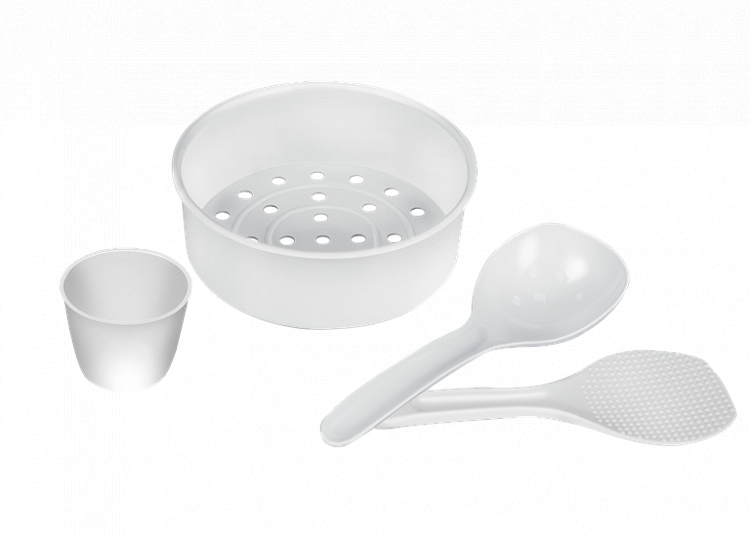 защита от включения без чаши; комплектация: ложка, черпак, мерный стакан, контейнер для приготовления на пару, книга "120 рецептов"