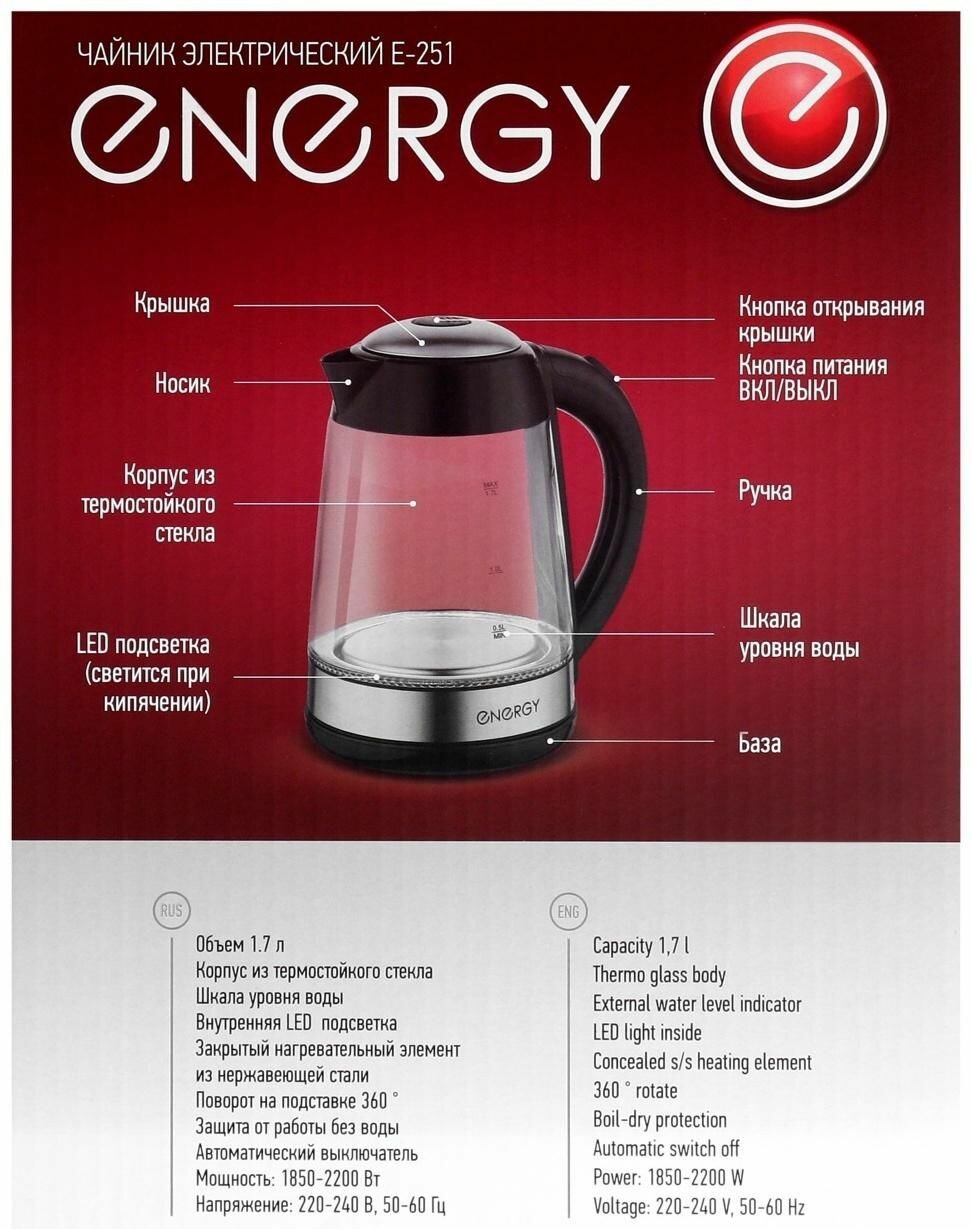 Ниже Вы можете прочитать отзывы на Чайник ENERGY E-251 1.7л 2200Вт, ознакомится с подробными характеристиками, посмотреть интересные обзоры и фотографии на Чайник ENERGY E-251 1.7л 2200Вт.