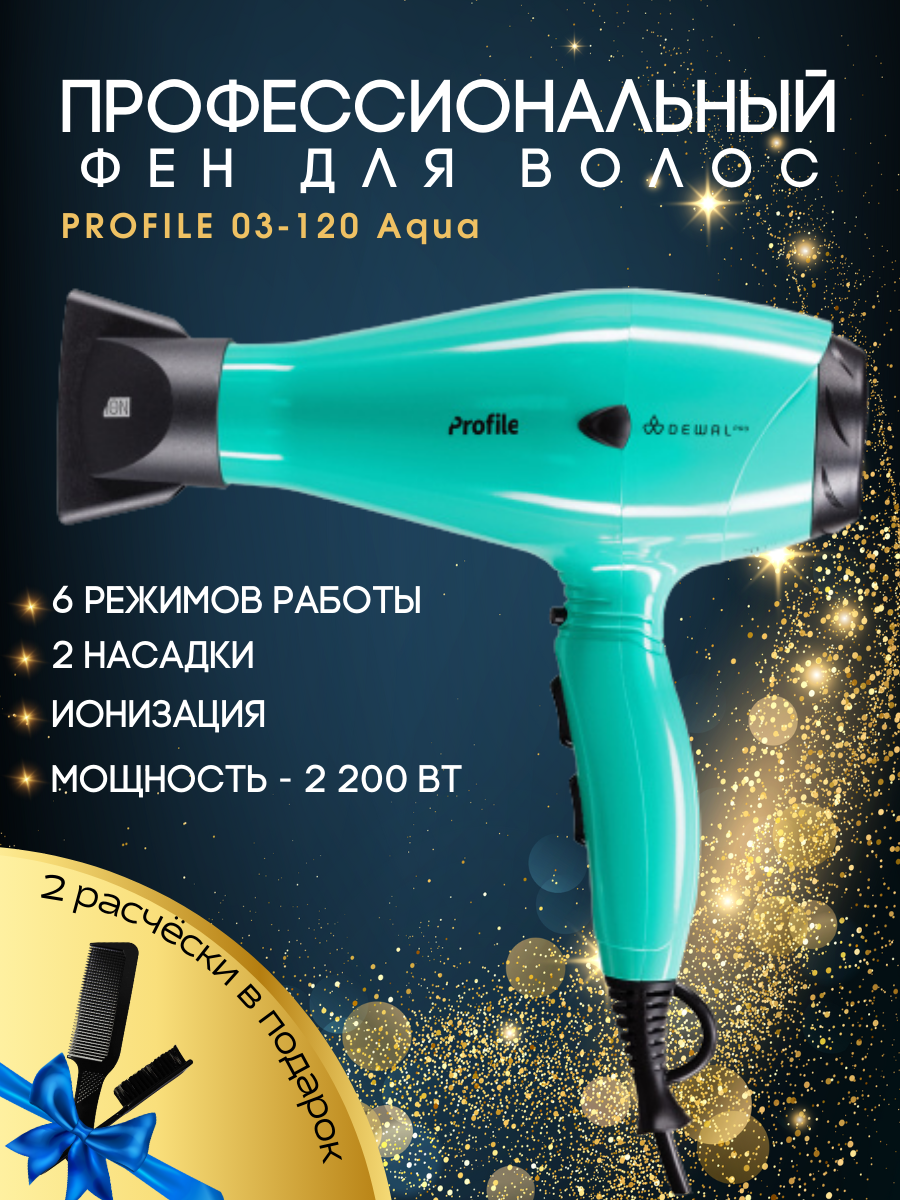 Фен DEWAL PROFILE 2200, аквамарин, вес 570гр, 2200Вт, ионизация, 2 насадки, провод 3м 03-120 Aqua