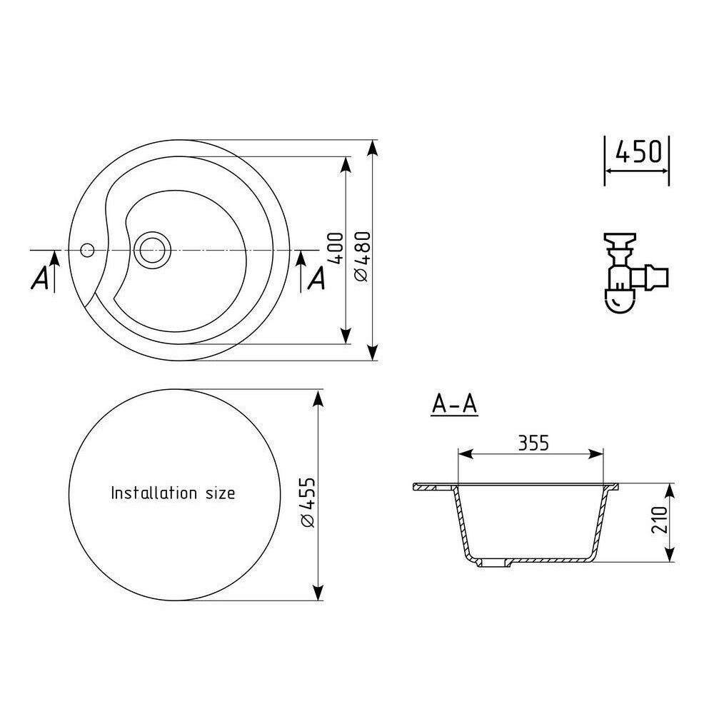 Мойка кухонная Ulgran из искусственного мрамора круглая U-102, цвет: черный, база: 45.5х45.5 см, арт. U-102-308