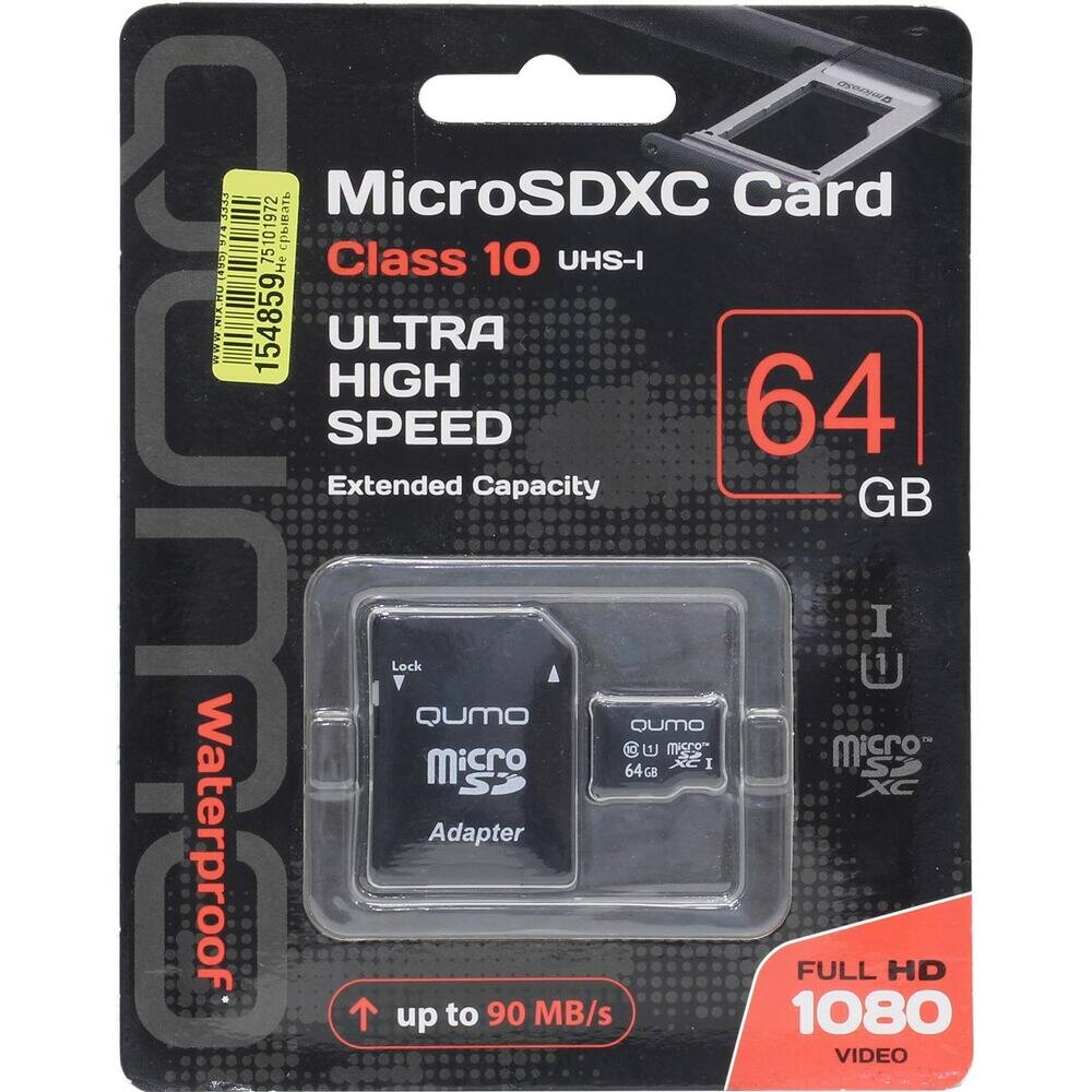 Карта памяти microSDXC Qumo QM64GMICSDXC10U1 64 Гб класс 10 UHS-I - 90*20 МБ/с FULL HD 1080 Video - с адаптером SD