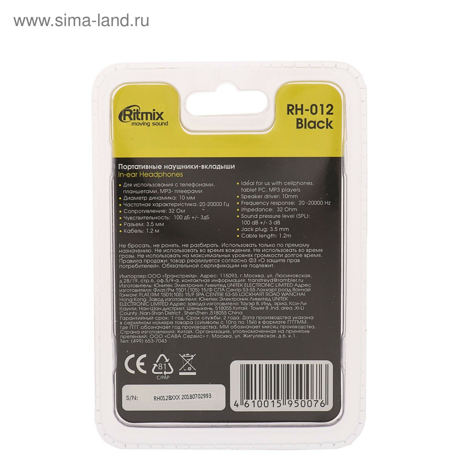 Купить RITMIX Наушники Ritmix RH-012, вакуумные, 100 дБ, 32 Ом, 3.5 мм, 1.2 м, черные