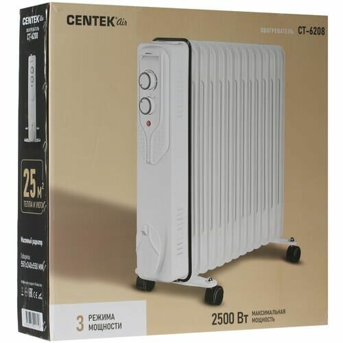 Обогреватель электрический масляный CENTEK CT-6208: белый, 13 секций, 25м2, 2500Вт, 3 режима, защита от перегрева, терморегулятор, LED-индикатор