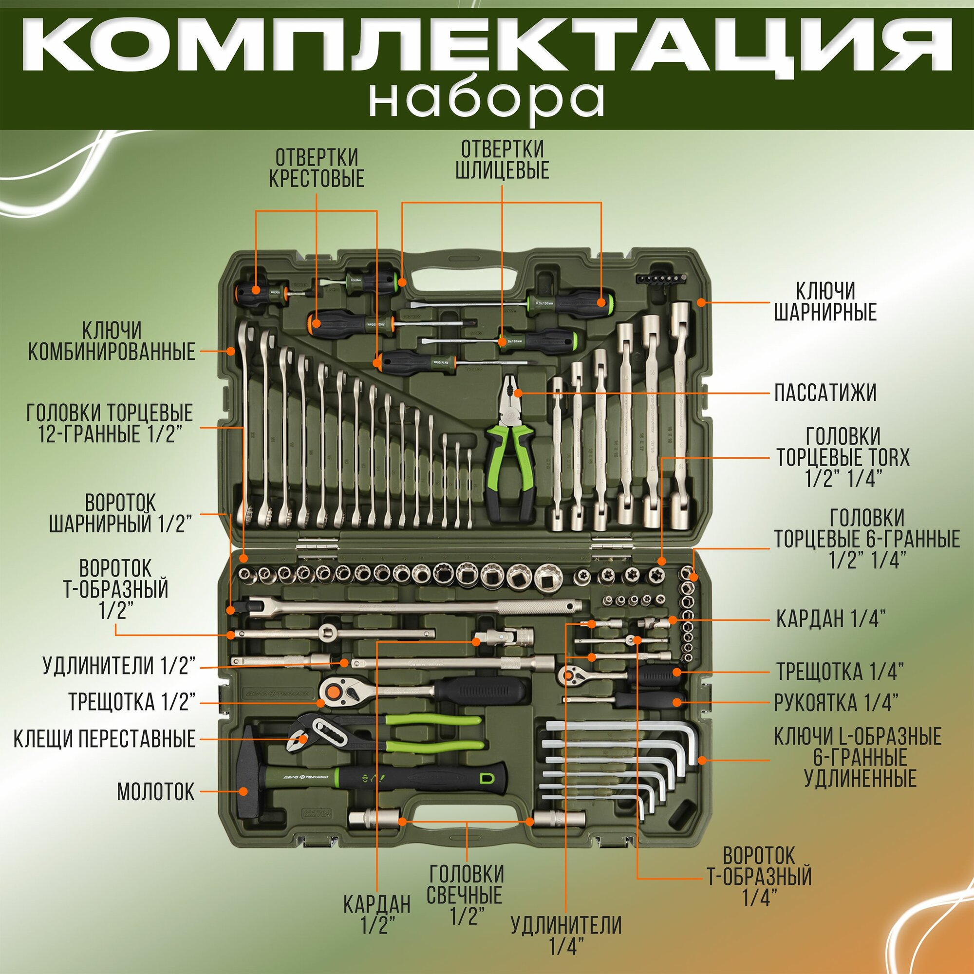 Дело Техники набор головок двенадцатигранных 1/4", 1/2" с инструментом, 89предм. 622789