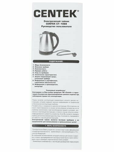 1068-CT Centek Чайник 2,0л, 2000 Вт, нержавеющая сталь