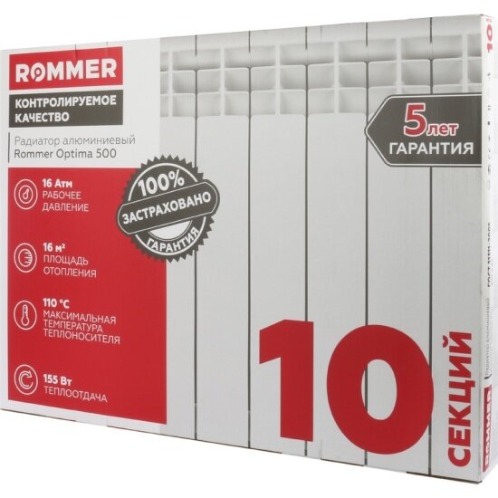 Радиатор алюминиевый Optima 500 10 секций RAL9016 (89559) | код RG008P2HSF51GS | Rommer ( 1шт. )