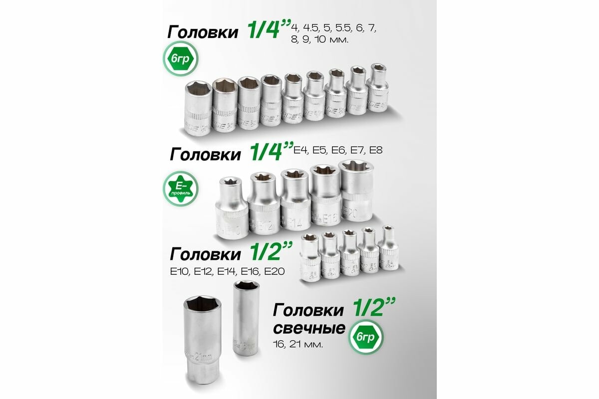| Головки торцевые подробно | 1/4": 4, 4.5, 5, 5.5, 6, 7, 8, 9, 10 мм; Torx 1/4": E4, E5, E6, E7, E8; трещотка 1/4"; удлинитель 1/4": 50, 100 мм; гибкий удлинитель… 1/4": 150 мм; карданный шарнир 1/4"; 3/8": 6, 7, 8, 9, 10, 11, 12, 13, 14, 15, 17, 18, 19, 21, 22 мм; трещотка 3/8"; удлинитель 3/8": 75, 150 мм; карданный шарнир 3/8"; 1/2": 8, 10, 12, 13, 14, 15, 16, 18, 20, 22, 23, 24, 25, 27, 30, 32 мм; ударные 1/2": 17, 19, 21 мм; Torx 1/2": E10, E12, E14, E16, E20; свечные 1/2": 16, 21 мм; трещотка 1/2"; карданный шарнир 1/2"; удлинитель 1/2": 75, 250 мм; адаптер 3/8"(F)х1/2"(M) ещёскрыть |