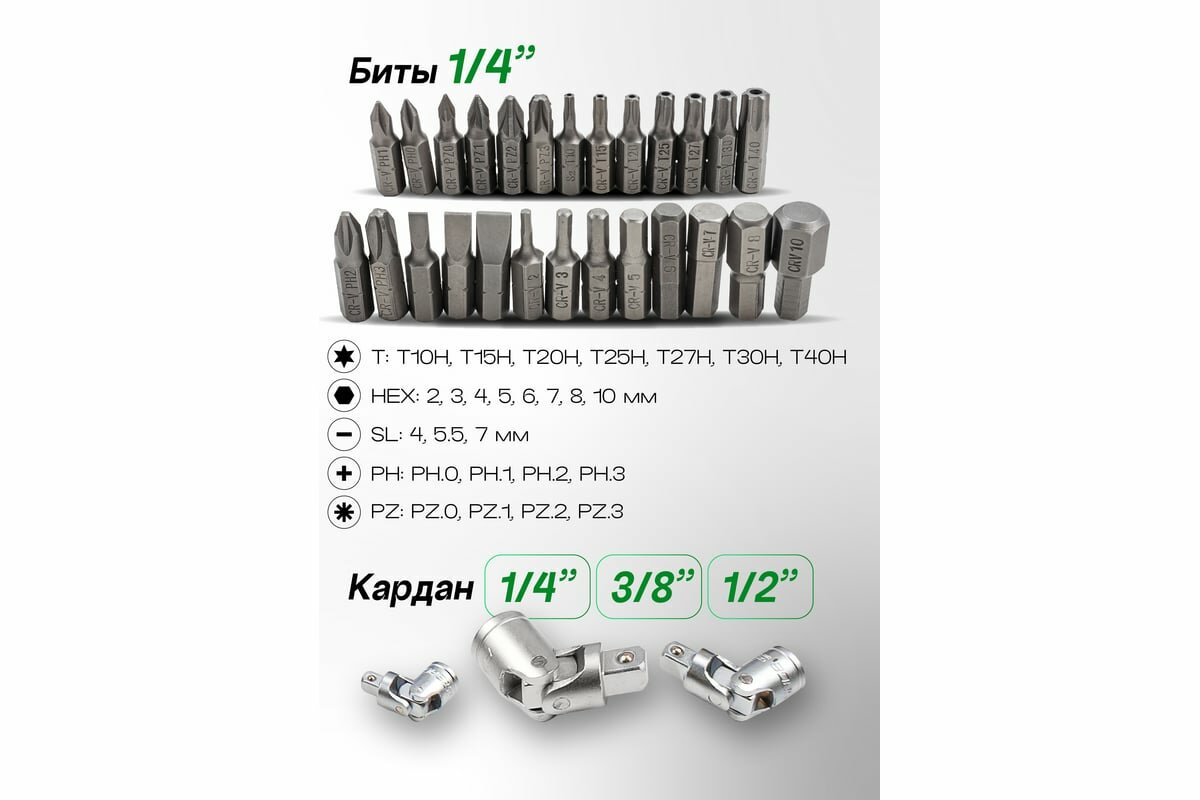 | Биты подробно | 1/4": H2, H3, H4, H5, H6, H7, H8, H10, T10H, T15H, T20H, T25H, T27H, T30H, T40H, SL4, SL5.5, SL7, PH0, PH1, PH2, PH3, PZ0, PZ1, PZ2, PZ3 |