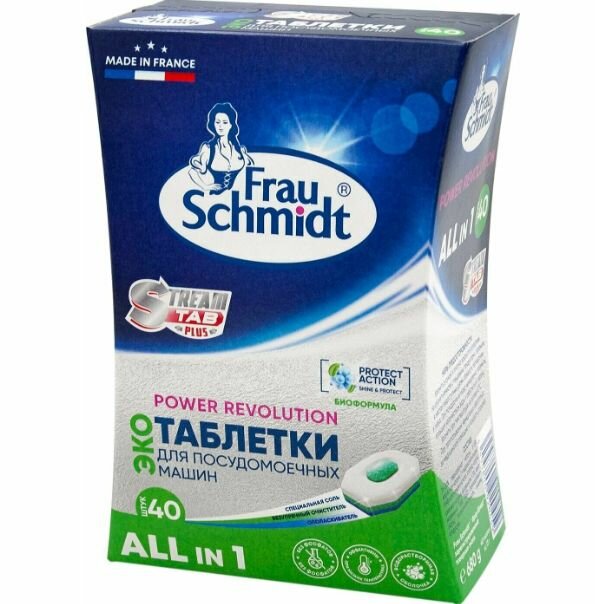 Frau Schmidt Power Revolution Эко Таблетки для посудомоечных машин всё в одном без фосфатов в водорастворимой оболочке 40 шт