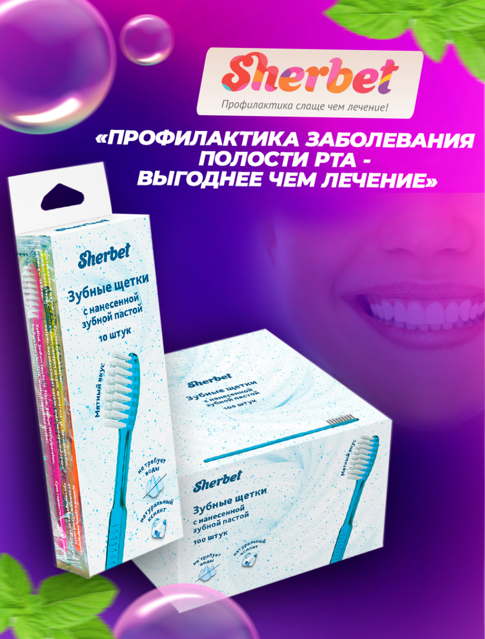 Зубная щетка Sherbet с нанесенной зубной пастой, 100 шт