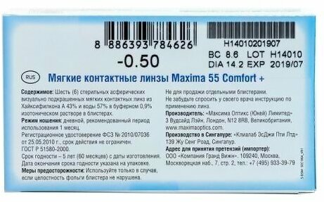 Maxima 55 Comfort Plus 6 линз В упаковке 6 штук Оптическая сила -0.5 Радиус кривизны 8.6