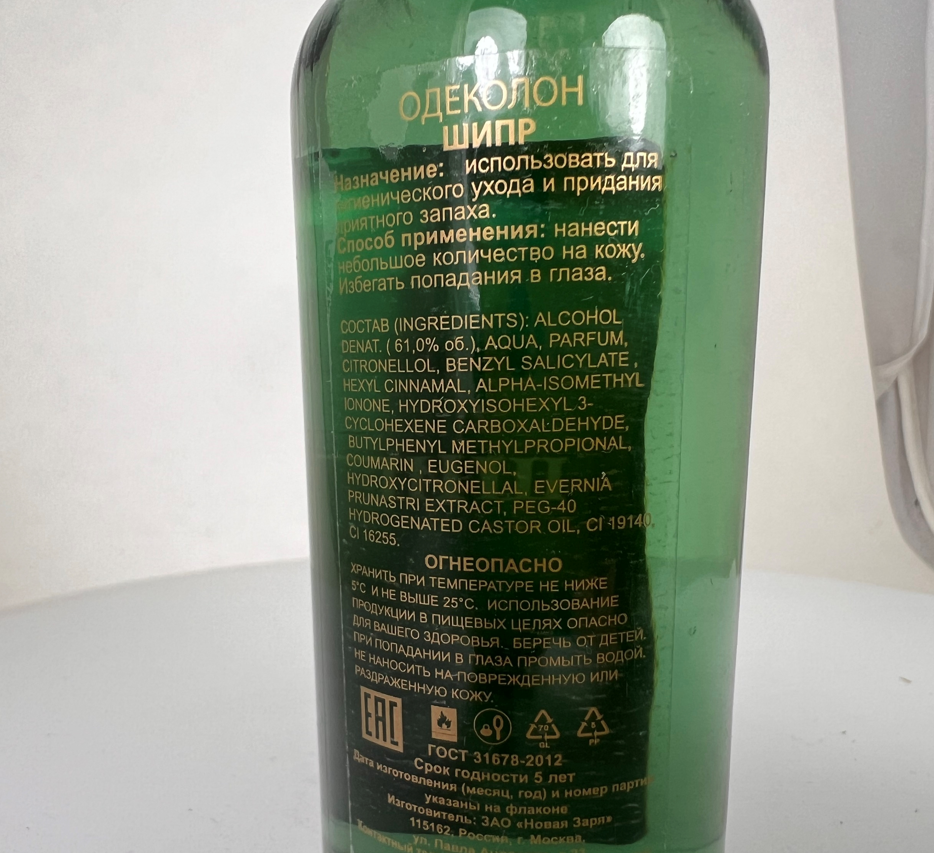 Классический одеколон "Шипр". Характерный аромат. Спирт 61%. Оформление хорошее. Недостатки: Не обнаружено. |