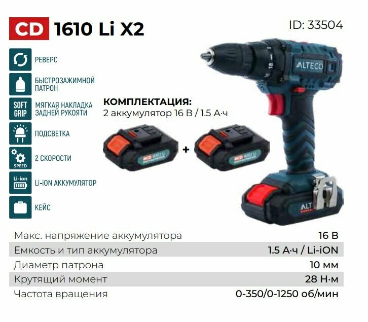 Аккумуляторная дрель-шуруповёрт Alteco CD 1610Li X2 33504