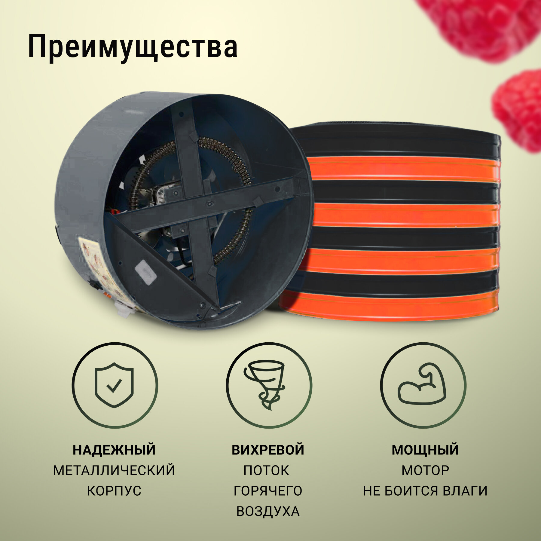 | Плюсы: | Большой объем, сравнительно быстро сушит, можно параллельно использовать как обогреватель. Сушу продукты и подогреваю в прохладные дни первый этаж дачи и частично второй. |
