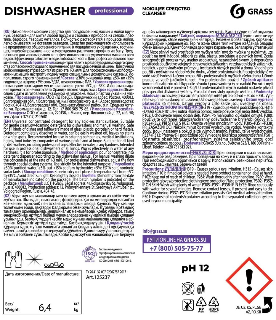Средство для мытья посуды GRASS в посудомоечных машинах 6,4 кг DISHWASHER, щелочное (125237)
