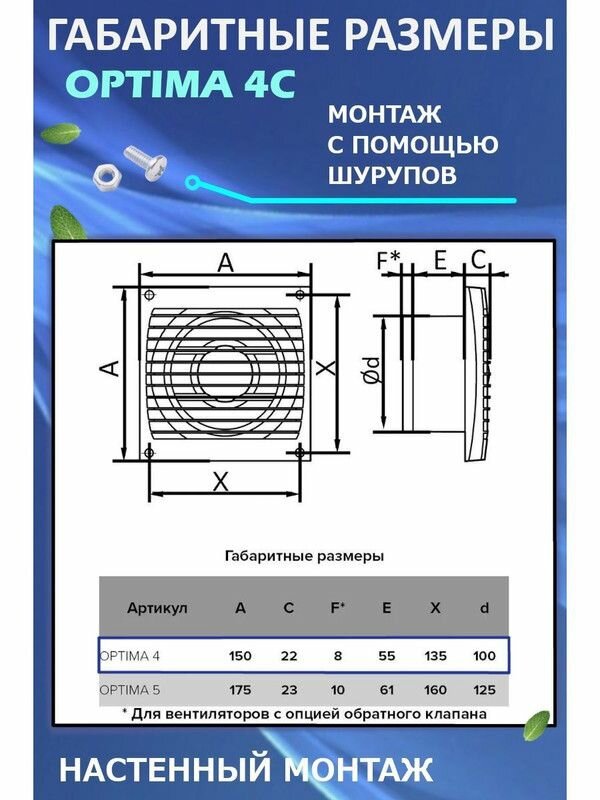 Вентилятор осевой вытяжной Auramax Optima 4C, с обратным клапаном, d 100, 14 Вт