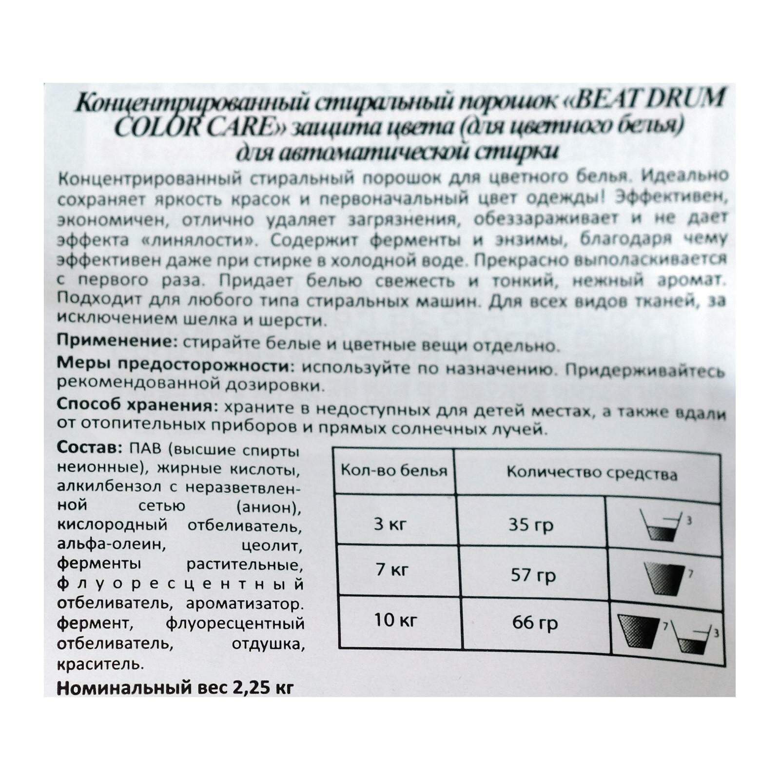 Купить Стиральный порошок Beat Drum Color, автомат, для цветного белья, 2,25 кг