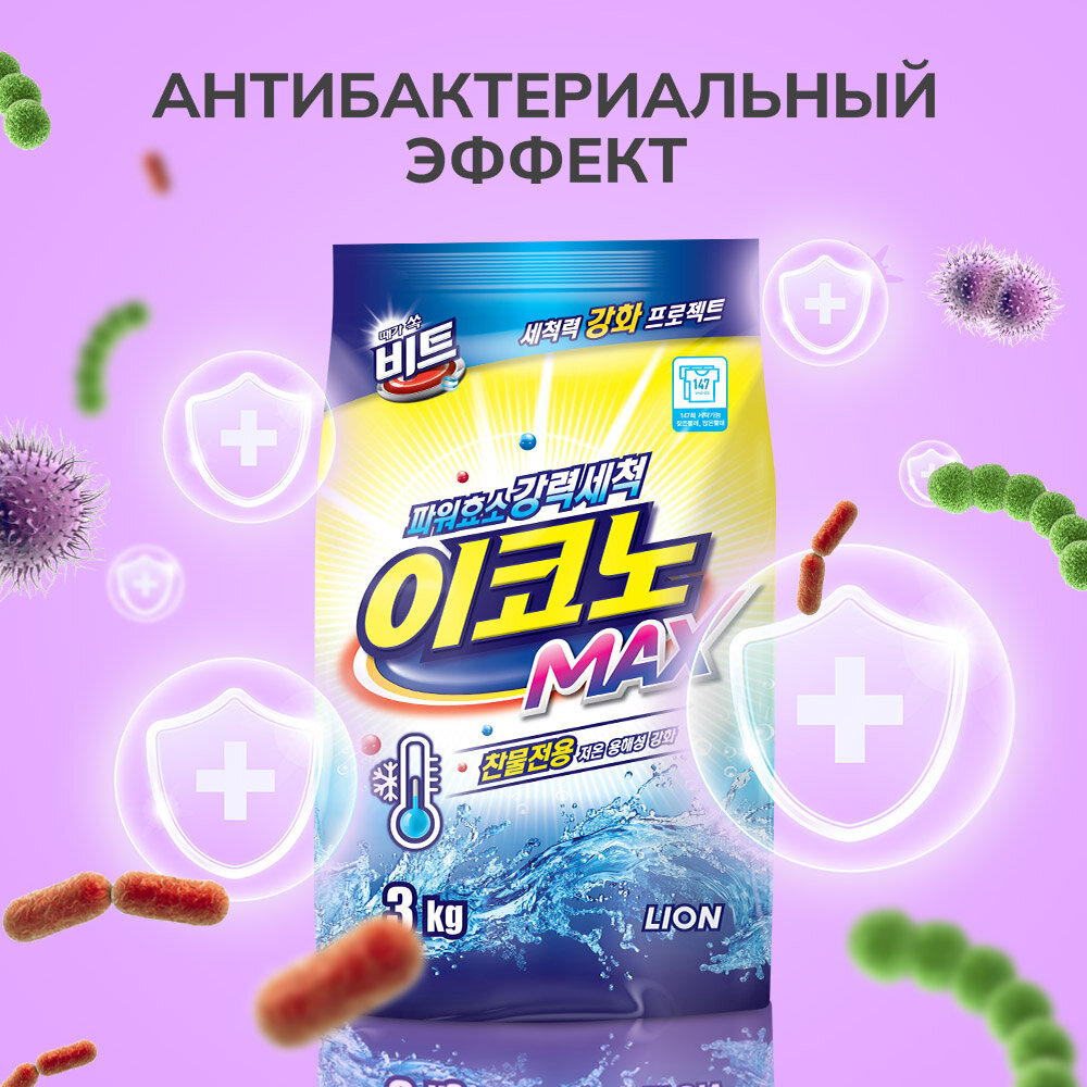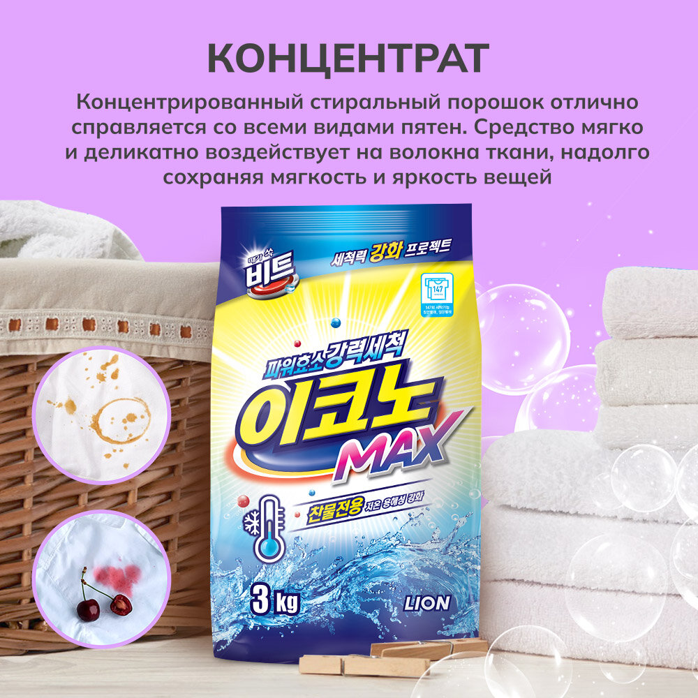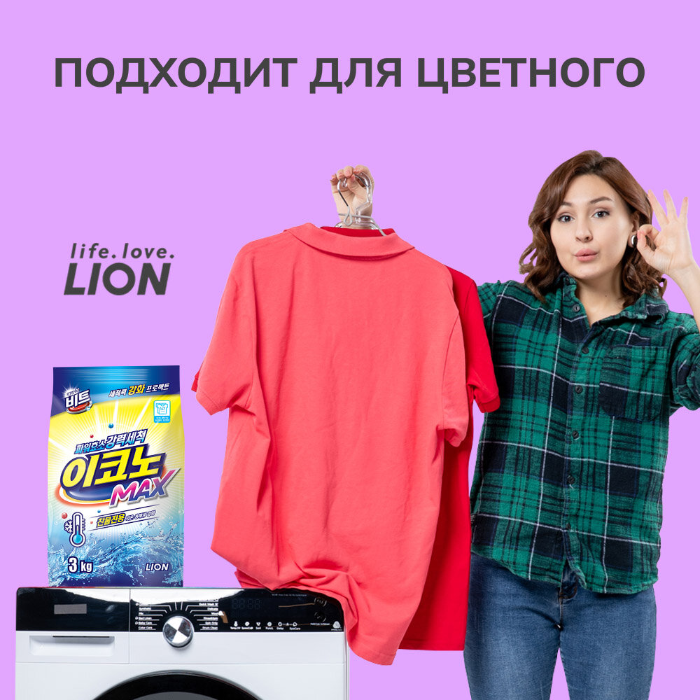 Стиральный порошок концентрированный LION beat EconoMAX для автоматической и ручной стирки в холодной воде, 3 кг