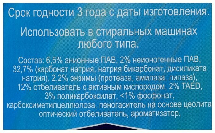 | Минусы: | Производитель пишет ,что 3 кг этого порошка равны 11 обычного,но может быть в Германии сверхмягкая вода и там он стирает отлично,но в нашей воде количество приходится увеличивать.При холодной воде стирает очень плохо,при 40 более менее.Запах самого порошка легкий химозный,после стирки белье не пахнет ничем.Так как нет смягчающих добавок,то после высыхания махровые полотенца и белье очень жесткое.Белое белье действительно отбеливается,но только после сильного увеличения дозы порошка.Нигде на упаковке не написано про экологичность порошка и тем более про гипоаллергенность. |
