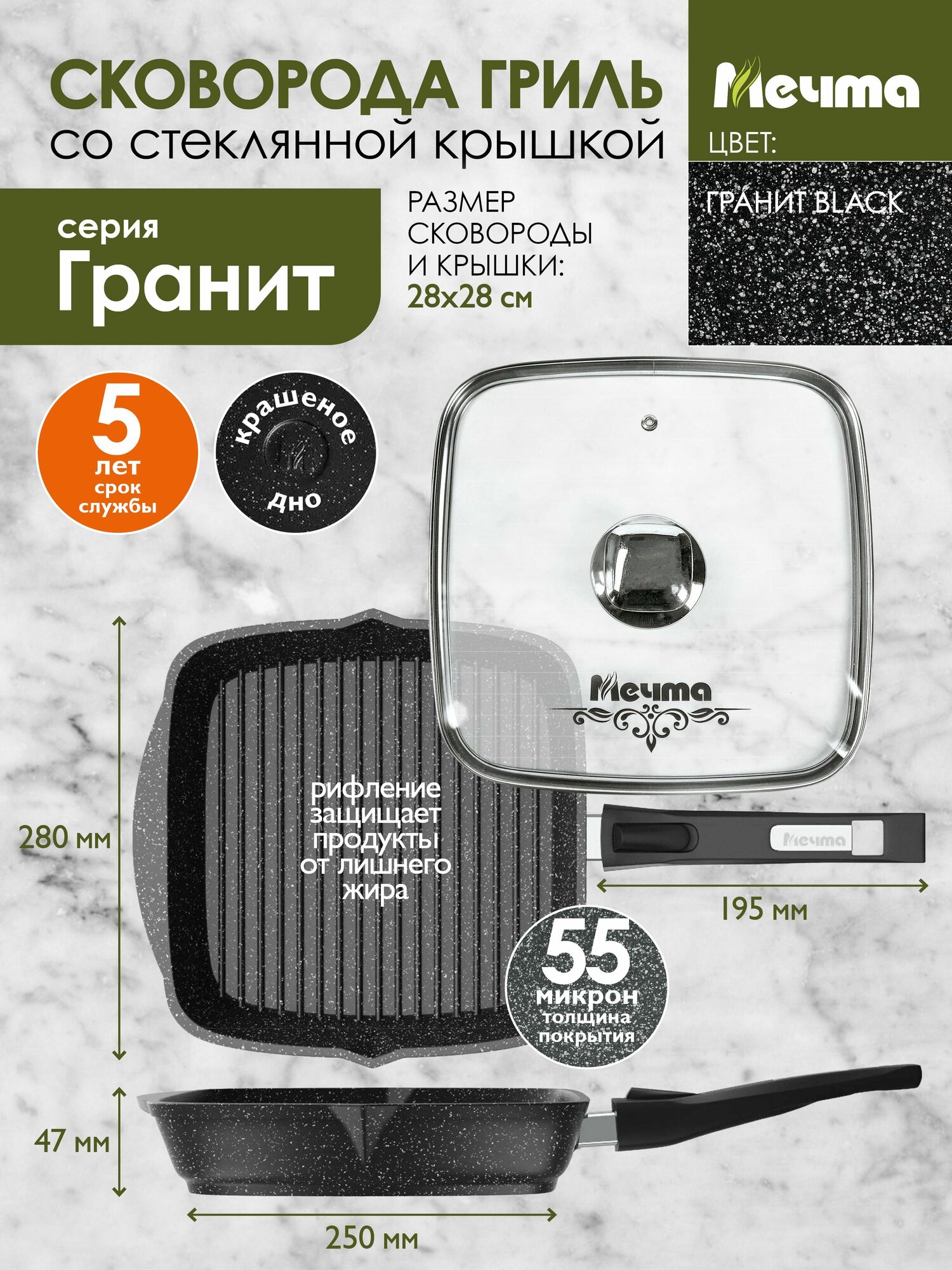 Ниже Вы можете прочитать отзывы на Мечта Сковорода-гриль квадр. 28*28 см со съемной ручкой и стекл. крышкой АП Гранит black с06880, ознакомится с подробными характеристиками, посмотреть интересные обзоры и фотографии на Мечта Сковорода-гриль квадр. 28*28 см со съемной ручкой и стекл. крышкой АП Гранит black с06880.