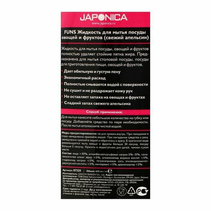 Funs / Жидкость для мытья посуды Funs овощей и фруктов свежий апельсин 600мл 1 шт