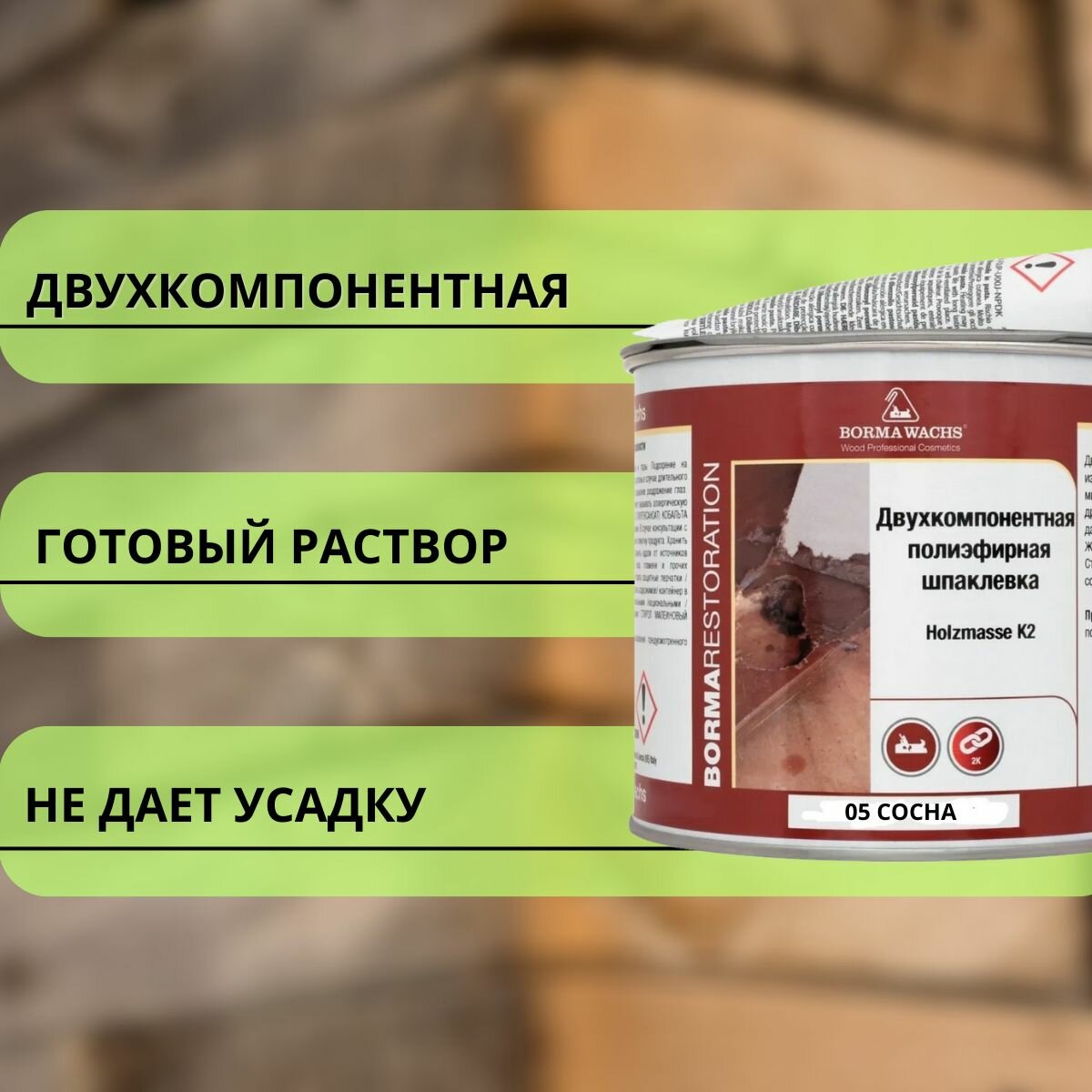 Шпаклевка полиэфирная двухкомпанентная Сосна 05 Borma HOLZMASSE K2 750мл 1960PI-6T интересное: