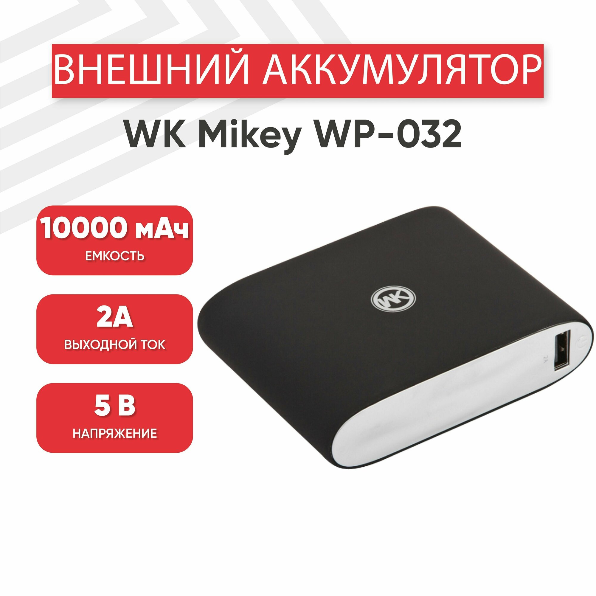Внешний аккумулятор (Повербанк (powerbank), аккумуляторная батарея) WK Mikey WP-032, 10000мАч, 2хUSB, 2А, Li-Ion, черный