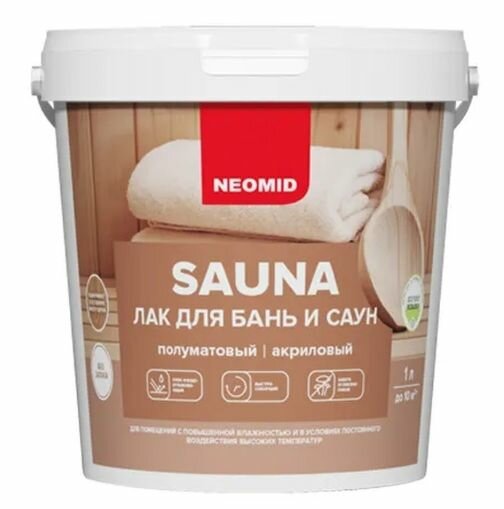 Акриловый лак для бань и саун NEOMID SAUNA полуматовый, без запаха (1 л) / Для защиты древесины во влажных условиях
